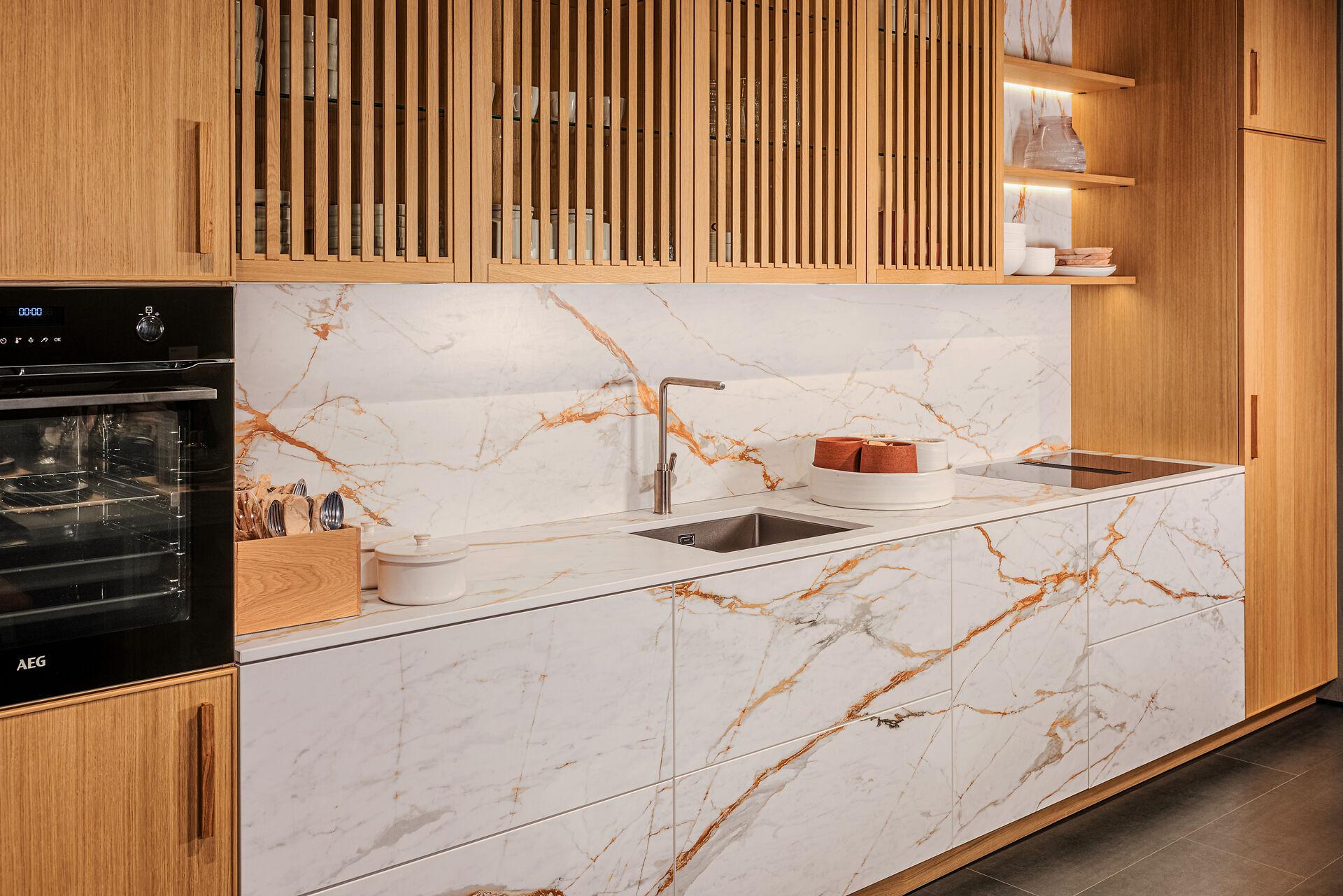 Eine moderne Küche mit raffinierter Eleganz und einer tiefen Verbindung zur Natur. Warme Holztöne umrahmen die zeitlos schöne Keramikoberfläche in perfekter Symbiose. Die Lamellen-Holzelemente erzeugen ein Gefühl von Ruhe. Eine richtig gute Wahl, denn exzellente Qualität ist keine Ware von der Stange, sondern ein emotionales Ergebnis von Wunsch und Anspruch!